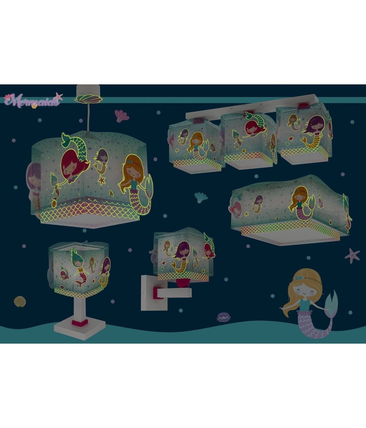 Mermaids Hängelampe für Kinder mit lustigen Meerjungfrauen. Sie enthält fluoreszierende Tinte, die im Dunkeln leuchtet. Sie muss nur 5–10 Minuten eingeschaltet sein, um aufgeladen zu werden… Dann ausschalten und das magische Leuchten genießen! Mit blendfreiem Diffusor und verstellbarer Höhe, ideal für Kinderzimmer und Spielbereiche. 100 % montiert.