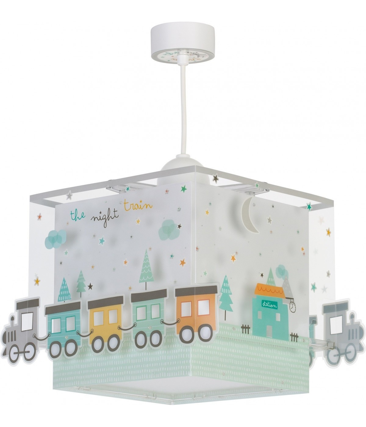 The Night Train Hängelampe für Kinder mit einem bunten Zug. Sie enthält fluoreszierende Tinte, die im Dunkeln leuchtet. Sie muss nur 5–10 Minuten eingeschaltet sein, um aufgeladen zu werden… Dann ausschalten und das magische Leuchten genießen! Mit blendfreiem Diffusor, ideal für Kinderzimmer und Spielbereiche. 100 % montiert.