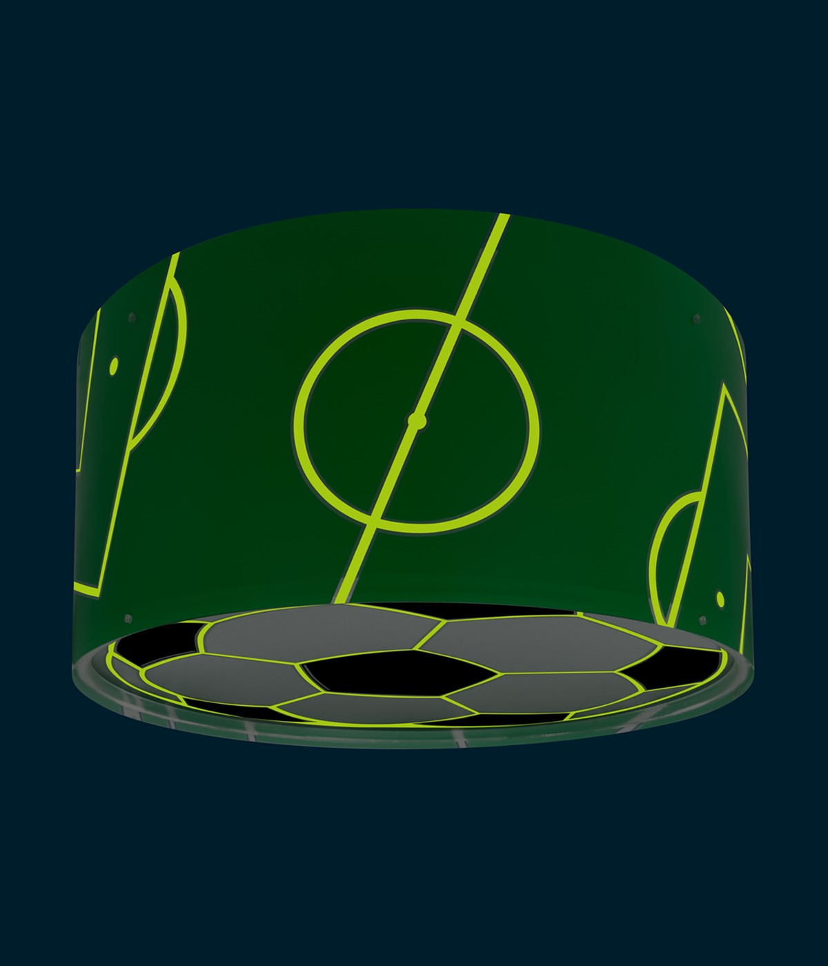 Kinder-Deckenleuchte Football Grün mit Fußballmotiv, leuchtet im Dunkeln. Sie enthält fluoreszierende Tinte, die im Dunkeln leuchtet. Sie muss nur 5–10 Minuten eingeschaltet sein, um aufgeladen zu werden… Dann ausschalten und das magische Leuchten genießen! Mit blendfreiem Diffusor für sanftes und sicheres Licht im Kinderzimmer. 100 % montiert.