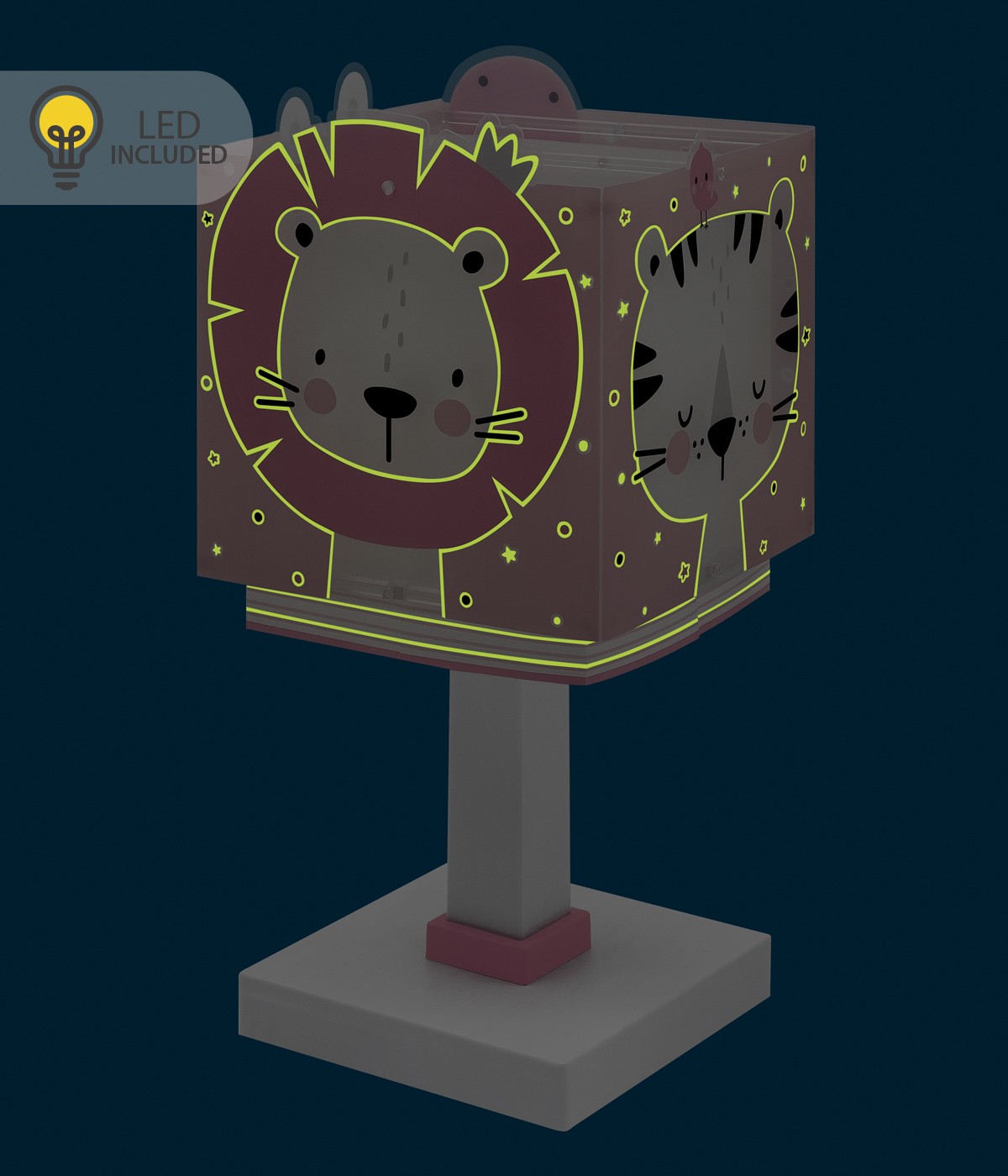 Die Kinder-Nachttischlampe Baby Jungle ist eine der Neuheiten von Dalber. Darauf sind lustige Löwen, Tiger, Bären und Kaninchen auf einem doppelten Schirm zu sehen. Dies ist die Version in Rosa, perfekt, um dem Nachttisch der Mädchen Farbe zu verleihen. Die Kinder-Nachttischlampe Baby Jungle ist aus transparentem Polypropylen gefertigt und hat einen Leuchteffekt: Die Konturen der Figuren leuchten einige Minuten lang schwach im Dunkeln, wenn die Kinder das Licht ausschalten. Sie werden es lieben!