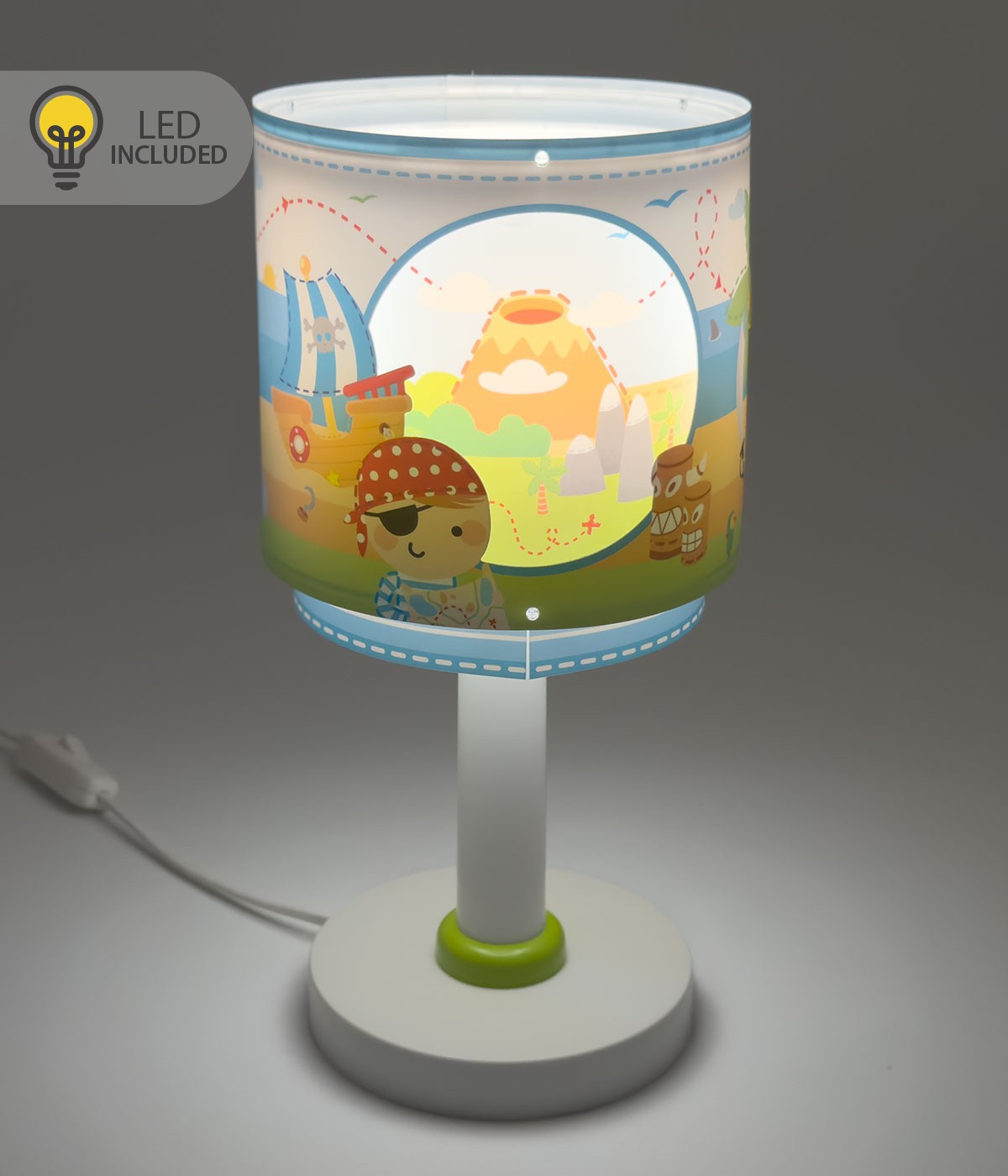 Pirate Island children's table lamp. Island in sight! The adventure begins with this friendly pirate in search of treasure. Contains fluorescent ink that glows in the dark; it only needs to be turned on for 5–10 minutes to charge… then turn it off and enjoy its magical glow!