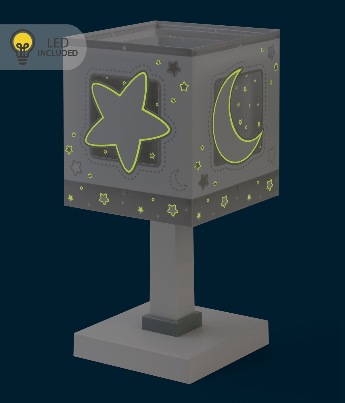 Square table lamp with outgoing moon and stars in grey color. Contains fluorescent ink that glows in the dark; it only needs to be turned on for 5–10 minutes to charge… then turn it off and enjoy its magical glow!
