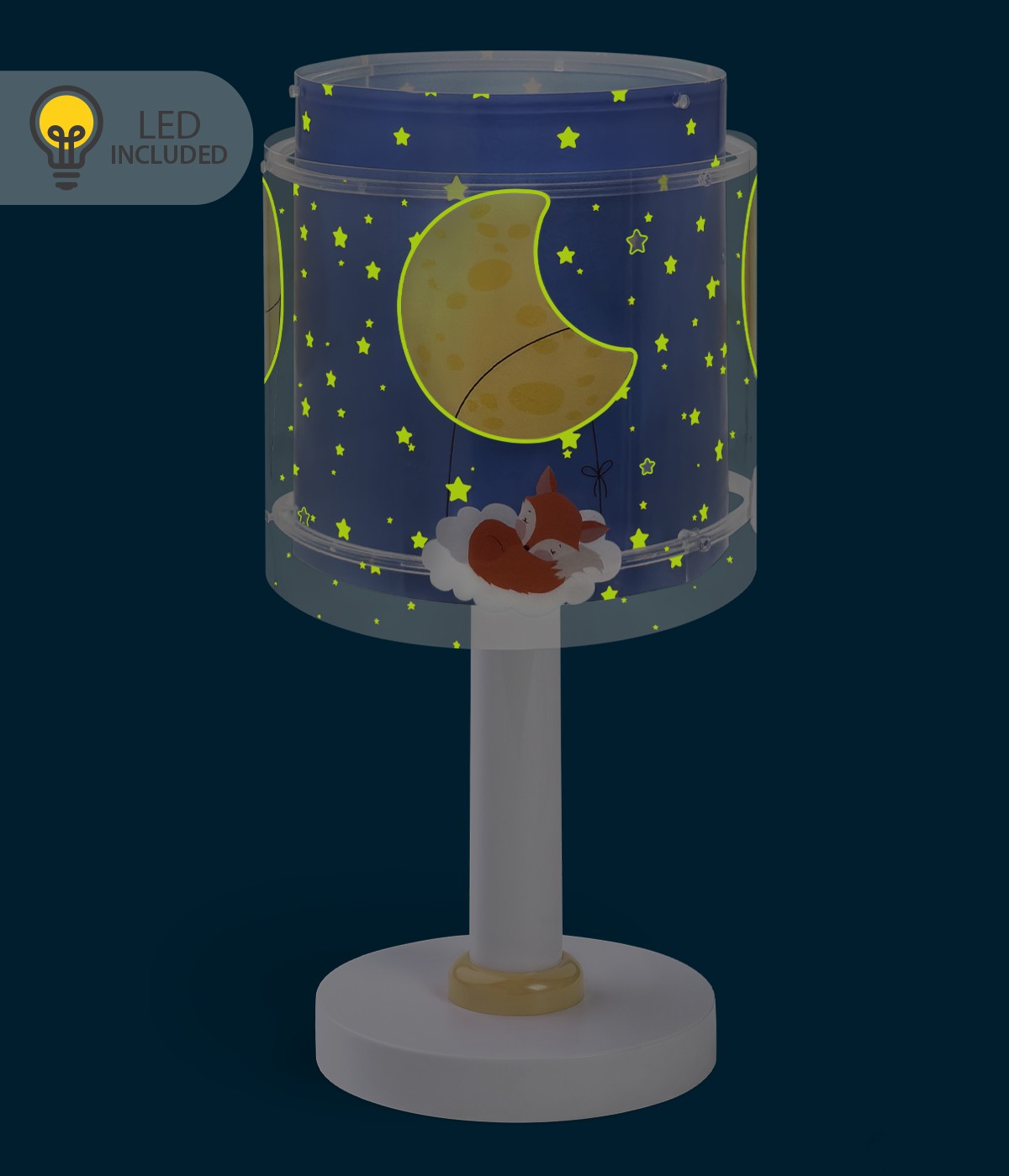 Children’s Moon Dream Table Lamp. Contains fluorescent ink that glows in the dark; it only needs to be turned on for 5–10 minutes to charge… then turn it off and enjoy its magical glow!