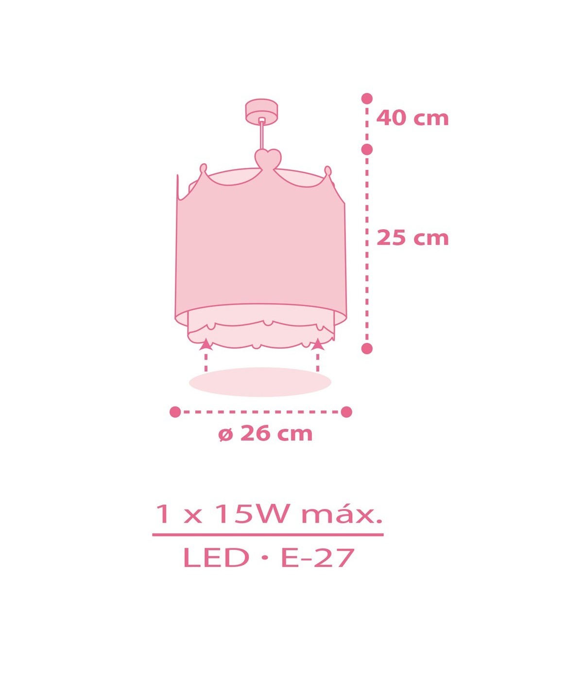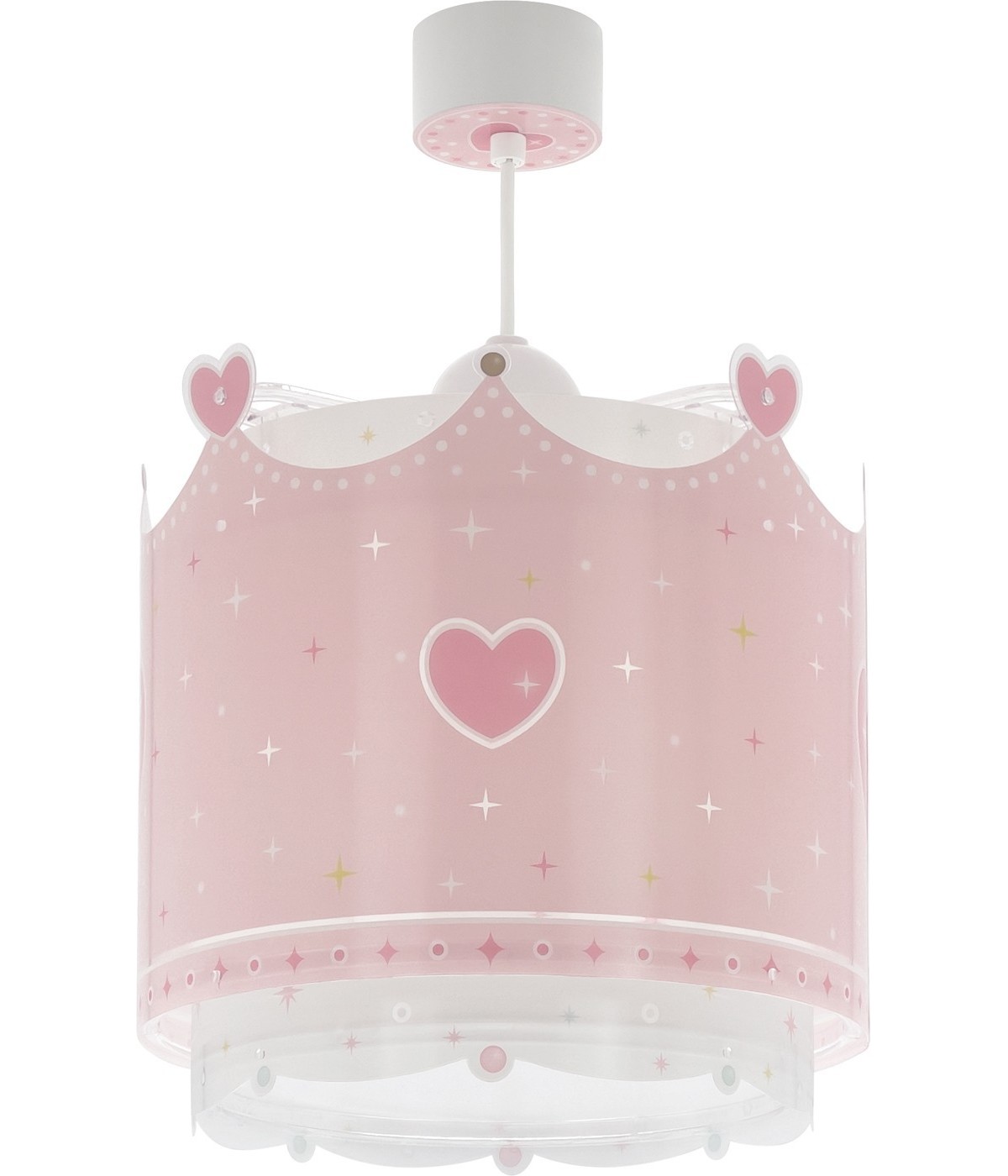 Children hanging lamp with crown design and heart decoration. It contains fluorescent ink that glows in the dark. Only 5–10 minutes to charge… Then turn it off and enjoy its magical glow! Features glare-free diffuser and adjustable height, perfect for bedrooms and play areas. 100% assembled.