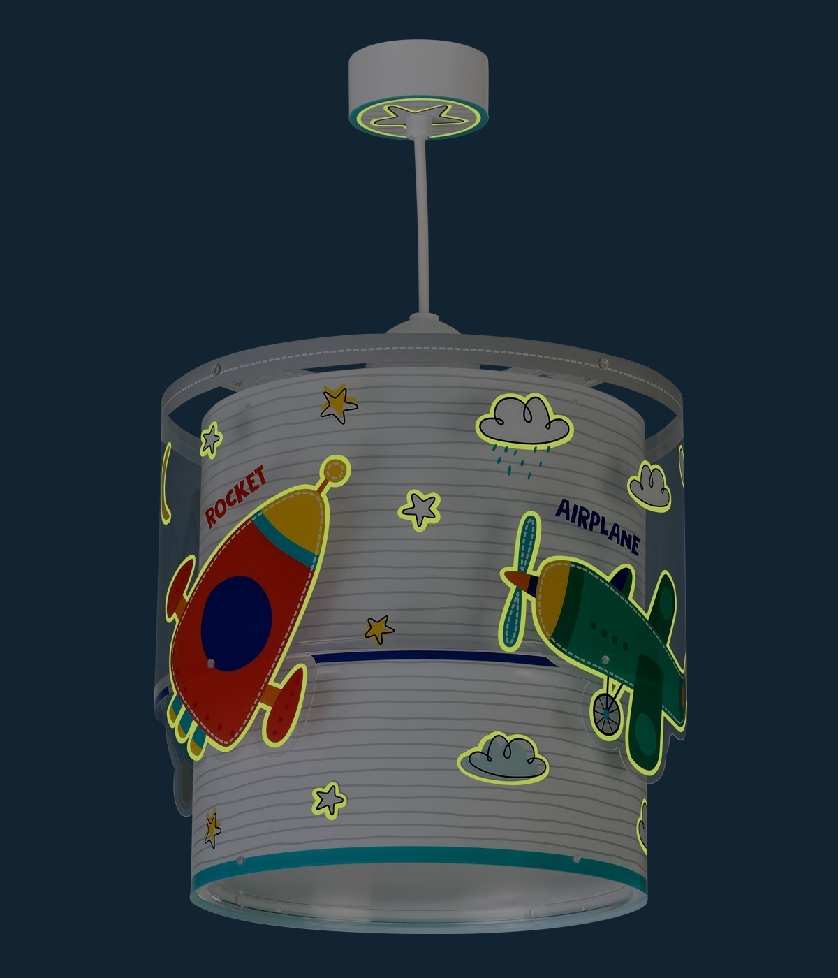 Hanging lamp for Kids round with planes with outgoing parts on the bottom part multicolor. It contains fluorescent ink that glows in the dark. Only 5–10 minutes to charge… Then turn it off and enjoy its magical glow! Features glare-free diffuser and adjustable height, perfect for bedrooms and play areas. 100% assembled.