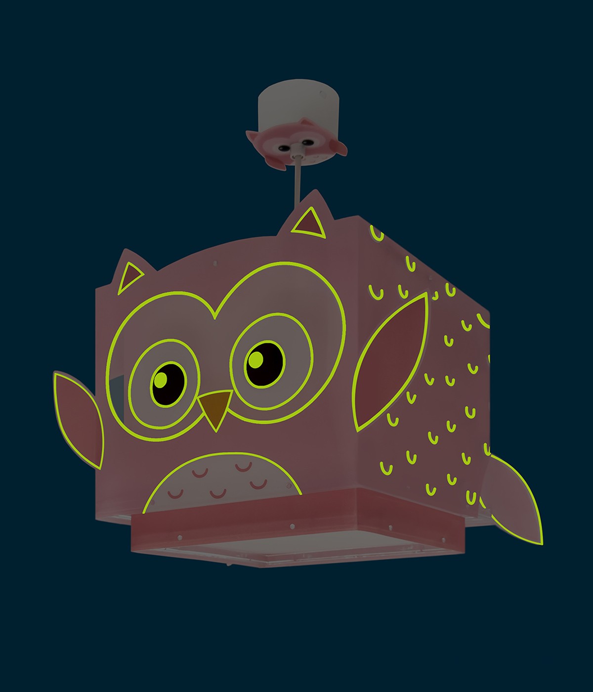 Little Pink Owl hanging lamp for children with a cute pink owl. It contains fluorescent ink that glows in the dark. Only 5–10 minutes to charge… Then turn it off and enjoy its magical glow! Features glare-free diffuser, perfect for bedrooms and play areas. 100% assembled.