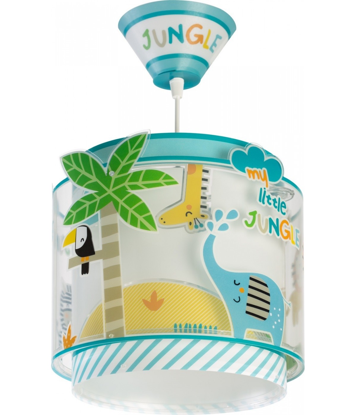 Hanging lamp round with forest animals multicolor with outgoing parts on top. It contains fluorescent ink that glows in the dark. Only 5–10 minutes to charge… Then turn it off and enjoy its magical glow! Features glare-free diffuser and adjustable height, perfect for bedrooms and play areas. 100% assembled.