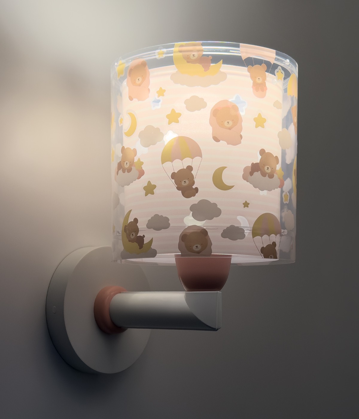 Aplique de pared infantil Baby Teddy Rosa Ositos. Contiene tinta fluorescente que brilla en la oscuridad; solo necesita estar encendido entre 5–10 minutos para cargarse… ¡Luego apágalo y disfruta de su brillo mágico! Se puede instalar directamente en la pared o mediante el cable con interruptor, adaptándose a tus necesidades.