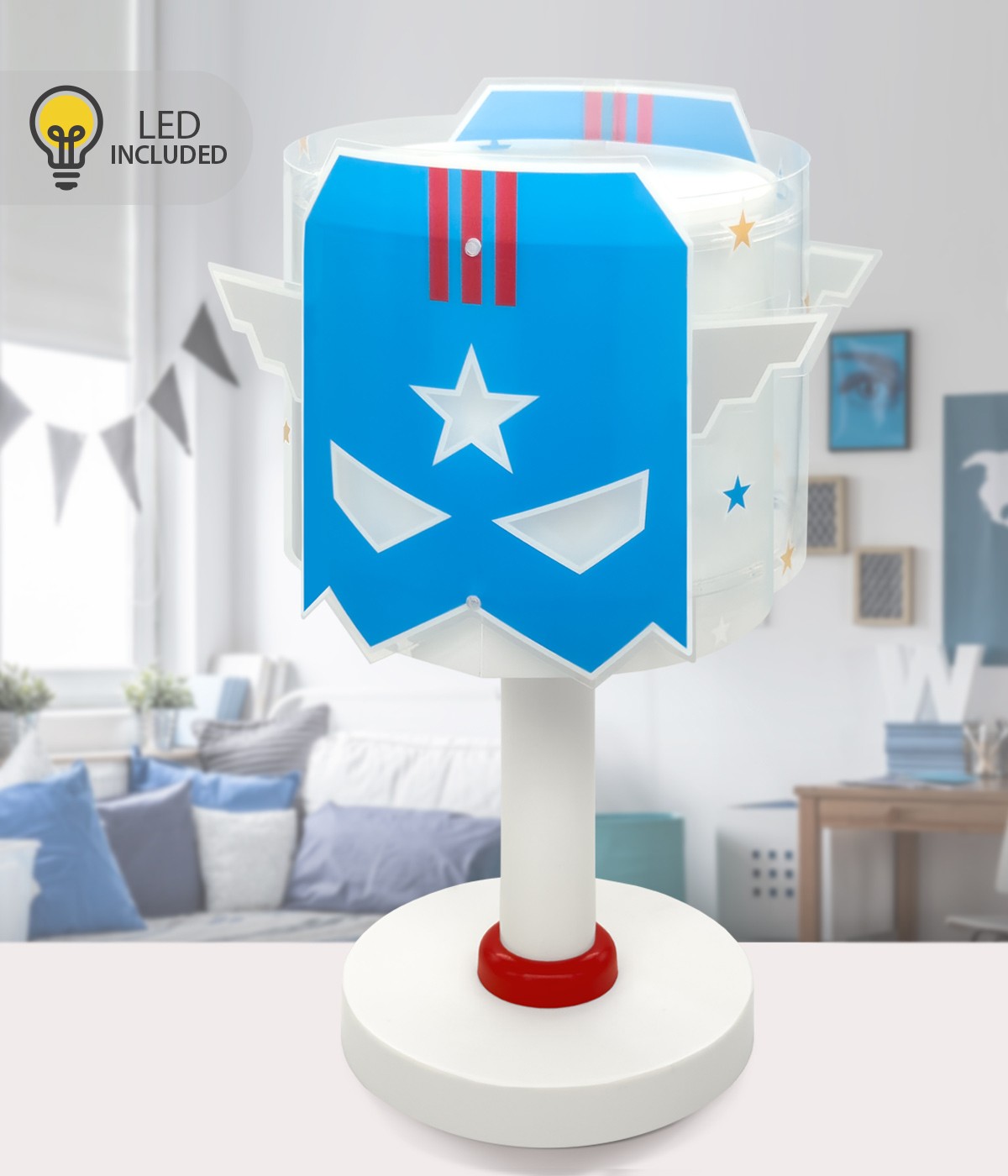 Lámpara de mesa infantil Blue Hero. Ilumina la valentía y la imaginación, con este superhéroe y convierte cada noche en una aventura épica. Fabricada con doble pantalla transparente de polipropileno. Brilla en la oscuridad!
