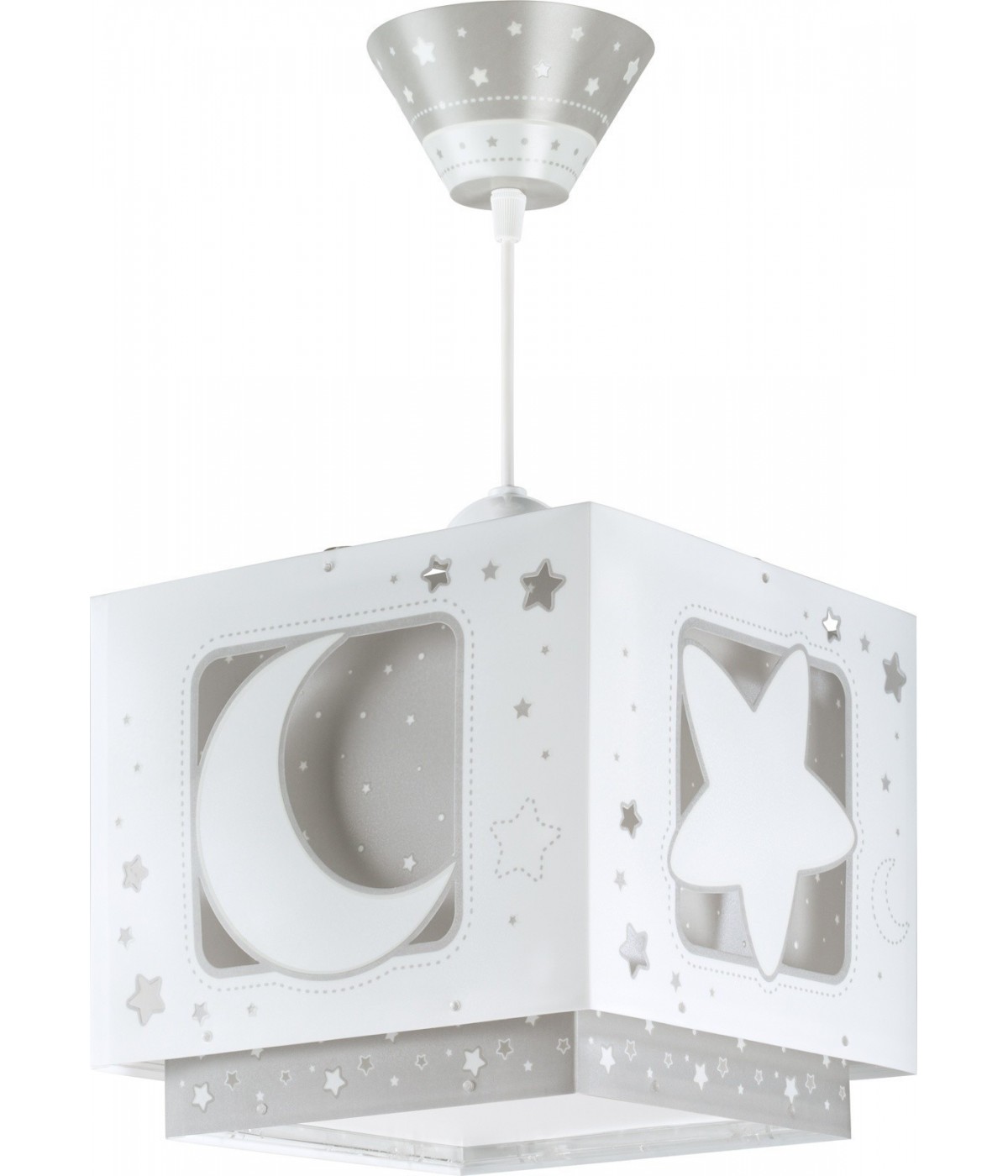 Lámpara colgante infantil Moonlight gris con luna y estrellas. Contiene tinta fluorescente que brilla en la oscuridad. Solo necesita estar encendida entre 5–10 minutos para cargarse… ¡Luego apágala y disfruta de su brillo mágico! Altura regulable para adaptarse a cualquier espacio. 100% montada.