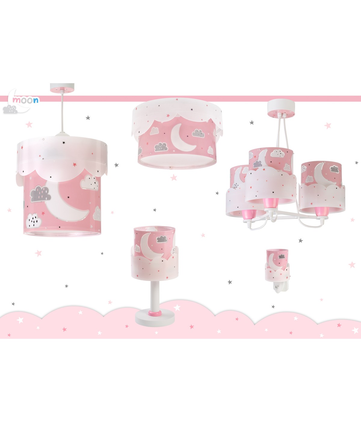 Plafón infantil Moon de luna y estrellas de color rosa, y brilla en la oscuridad.