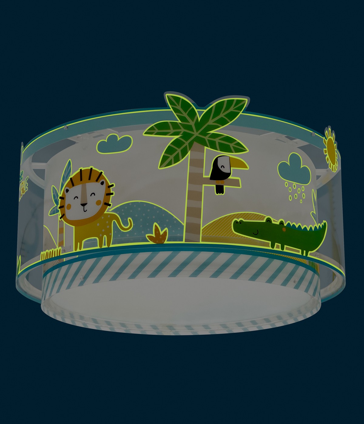 Plafón de techo infantil Happy Jungle con divertidos camaleones de colores. Contiene tinta fluorescente que brilla en la oscuridad. Solo necesita estar encendido entre 5–10 minutos para cargarse… ¡Luego apágalo y disfruta de su brillo mágico! Incluye difusor antideslumbrante para una iluminación suave y segura en la habitación infantil. 100% montada.