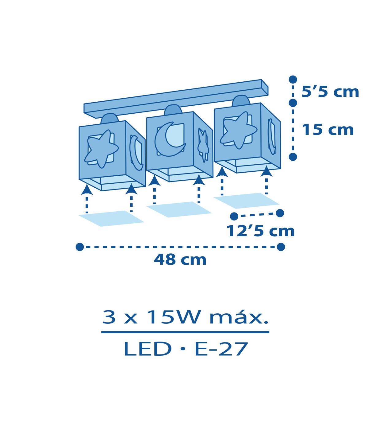 Le plafonnier pour chambre de garçon Moonlight bleu est parfait pour éclairer la chambre des enfants grâce à ses trois lumières. Il s'installe directement au plafond, ce qui facilitera une répartition homogène de la lumière dans toute la pièce, en évitant les zones ombragées ou mal éclairées. Avec son design de lumières et d'étoiles, il est parfait pour donner à la chambre des enfants une touche élégante et originale, tout en leur apportant la lumière parfaite. Il est fait de polypropylène transparent.