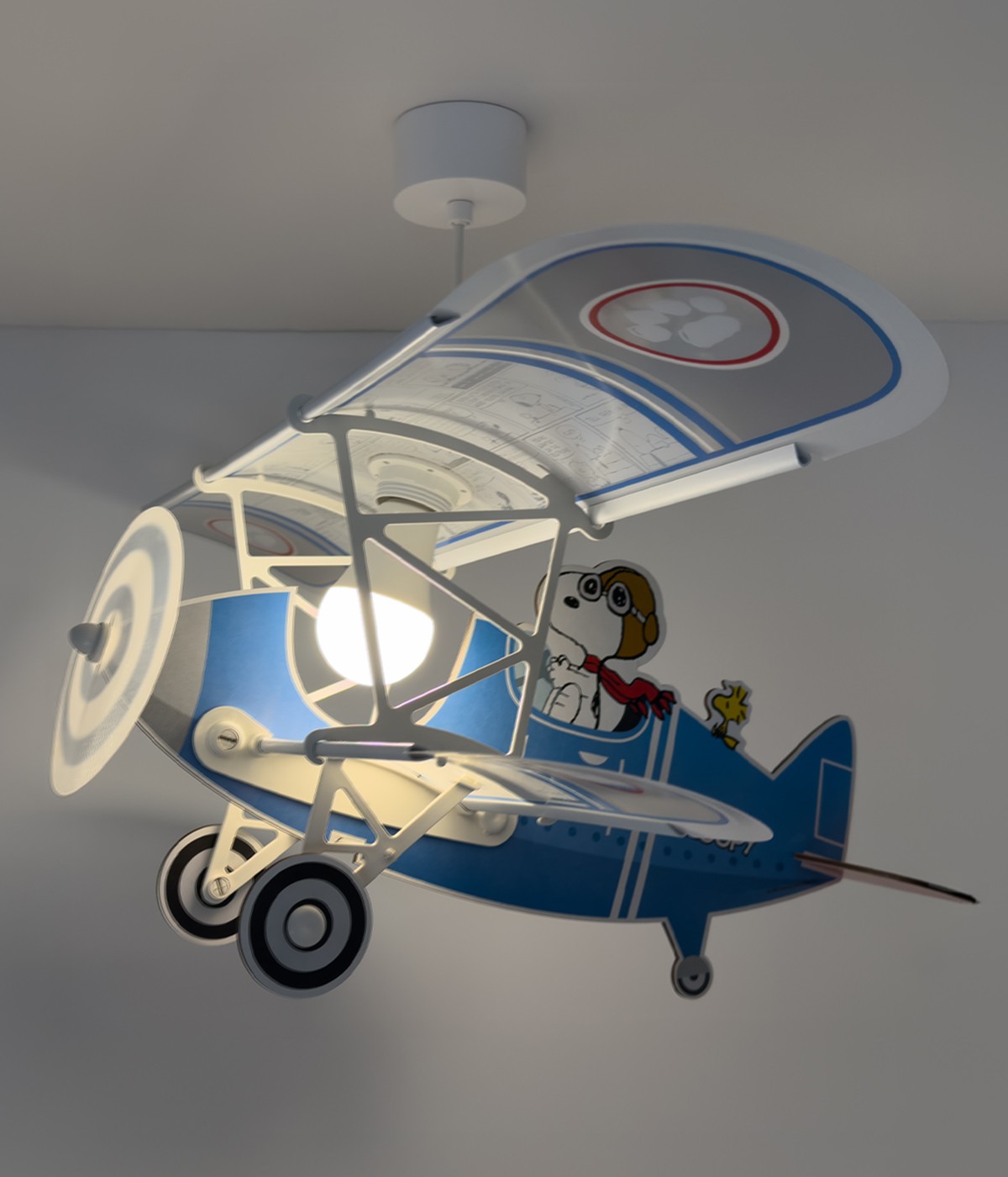 Avec ce lustre pour enfant original en forme d’avion, le célèbre beagle devient le meilleur compagnon des petites aventures aériennes. Son design coloré et plein de fantaisie apporte une touche unique à toute chambre d’enfant. Et quand la nuit tombe… la magie continue ! Grâce à son effet phosphorescent, la lampe crée une ambiance chaleureuse et imaginative. Parfaite pour rêver grand et décorer avec style l’univers de votre enfant.