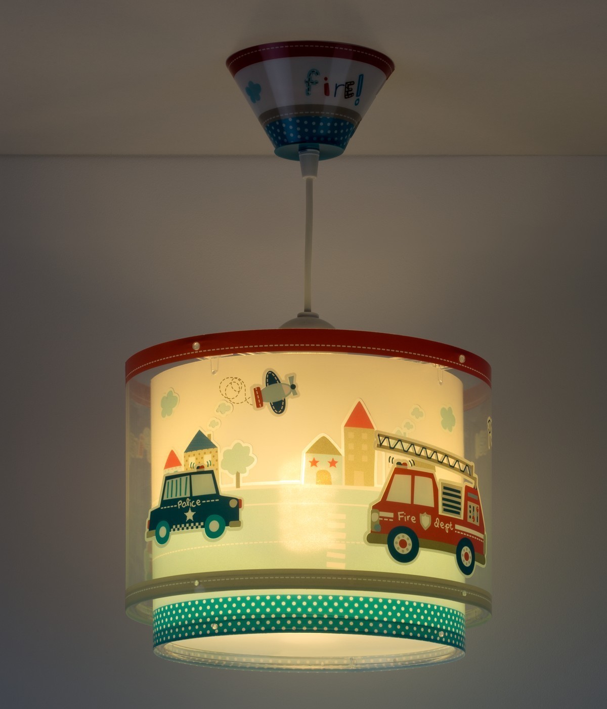 Luminaire à suspension pour enfants de la police, avec des véhicules de police et de pompiers et qui brille dans le noir. 100 % montée.