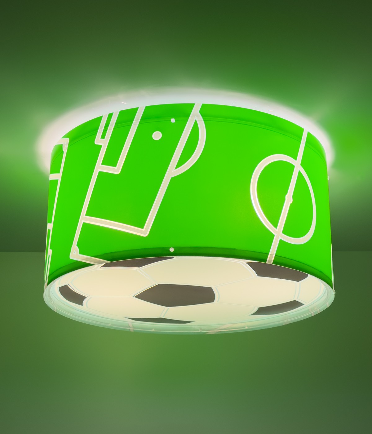 Plafonnier pour enfant Football de couleur vert et avec un diffuseur de lumière simulant le ballon, avec fluorescence faisant briller toutes les lignes du terrain et le ballon lorsque la lumière est éteinte.