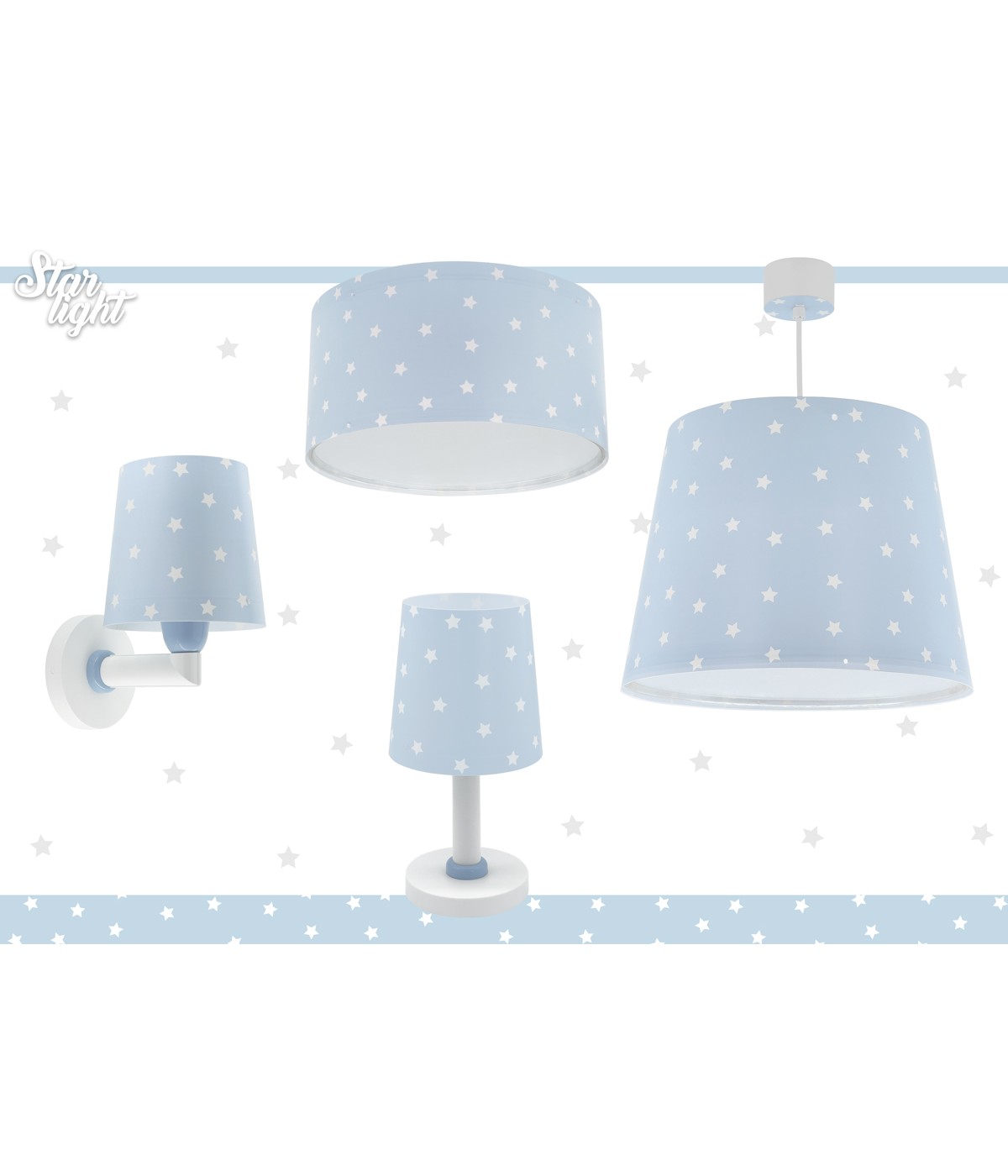 Lampe pour enfant bleu Star Light avec des étoiles qui brillent dans le noir. Elle contient de l’encre fluorescente qui brille dans l’obscurité. Il suffit de l’allumer pendant 5–10 minutes pour se charger… Ensuite, éteignez-la et profitez de sa lueur magique ! Comprend un diffuseur anti-éblouissement pour un éclairage doux et sûr dans la chambre des enfants. 100 % montée.
