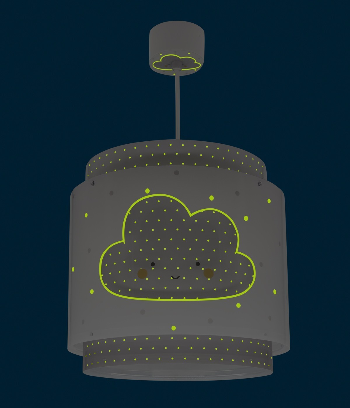 Lampada da soffitto per bambini Baby Dreams con tre piccole nuvole grigie. Contiene inchiostro fluorescente che brilla al buio. Basta lasciarla accesa per 5–10 minuti per caricarla… Poi spegnila e goditi il bagliore magico! Dispone di diffusore antiriflesso e altezza regolabile, perfetta per camere e aree gioco. 100% montata.
