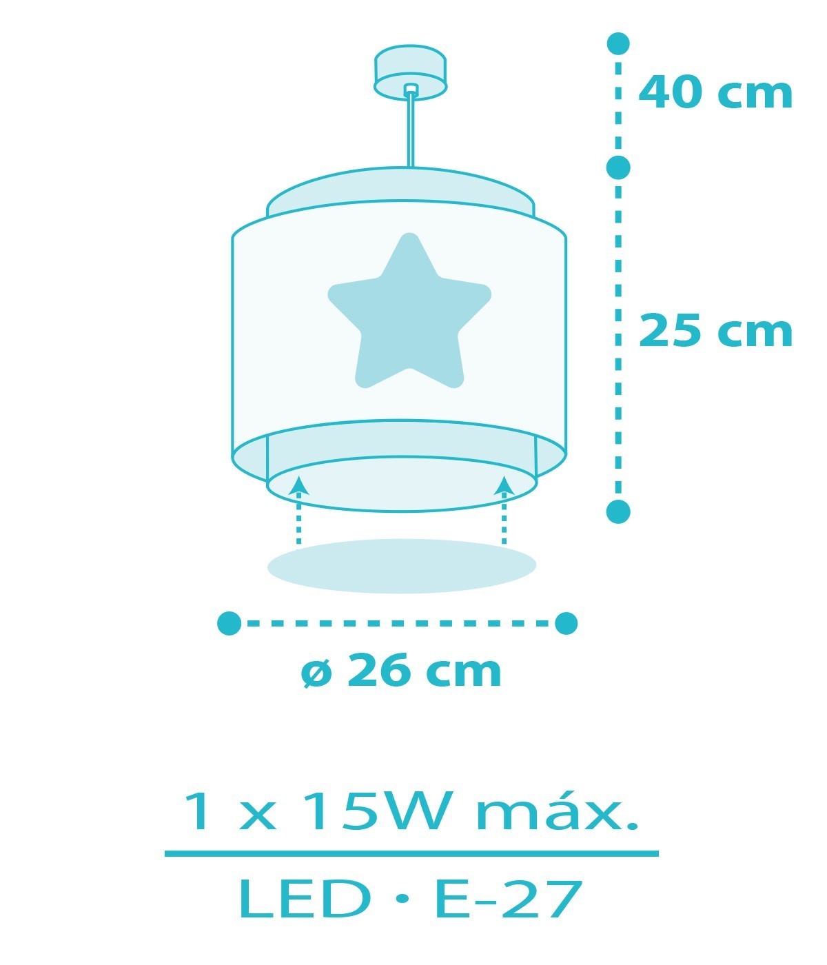 Lampada da soffitto per bambini Baby Dreams con tre piccole stelle blu. Contiene inchiostro fluorescente che brilla al buio. Basta lasciarla accesa per 5–10 minuti per caricarla… Poi spegnila e goditi il bagliore magico! Dispone di diffusore antiriflesso e altezza regolabile, perfetta per camere e aree gioco. 100% montata.
