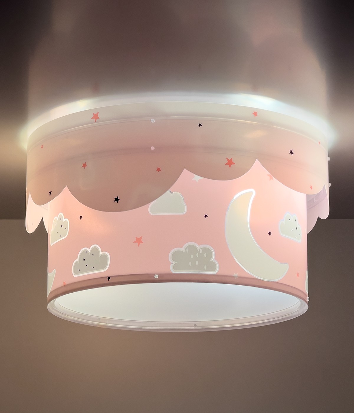 Lampada da soffitto a 2 luci con visello a forma di nuvola, con lune e stelle rosa, perfetta per illuminare la stanza senza ombre.
