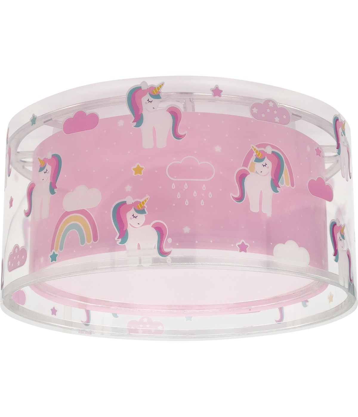 Lampada da soffitto a 2 luci con stampa unicorno, realizzata con doppio paralume trasparente rosa, ideale per illuminare la stanza senza ombre.