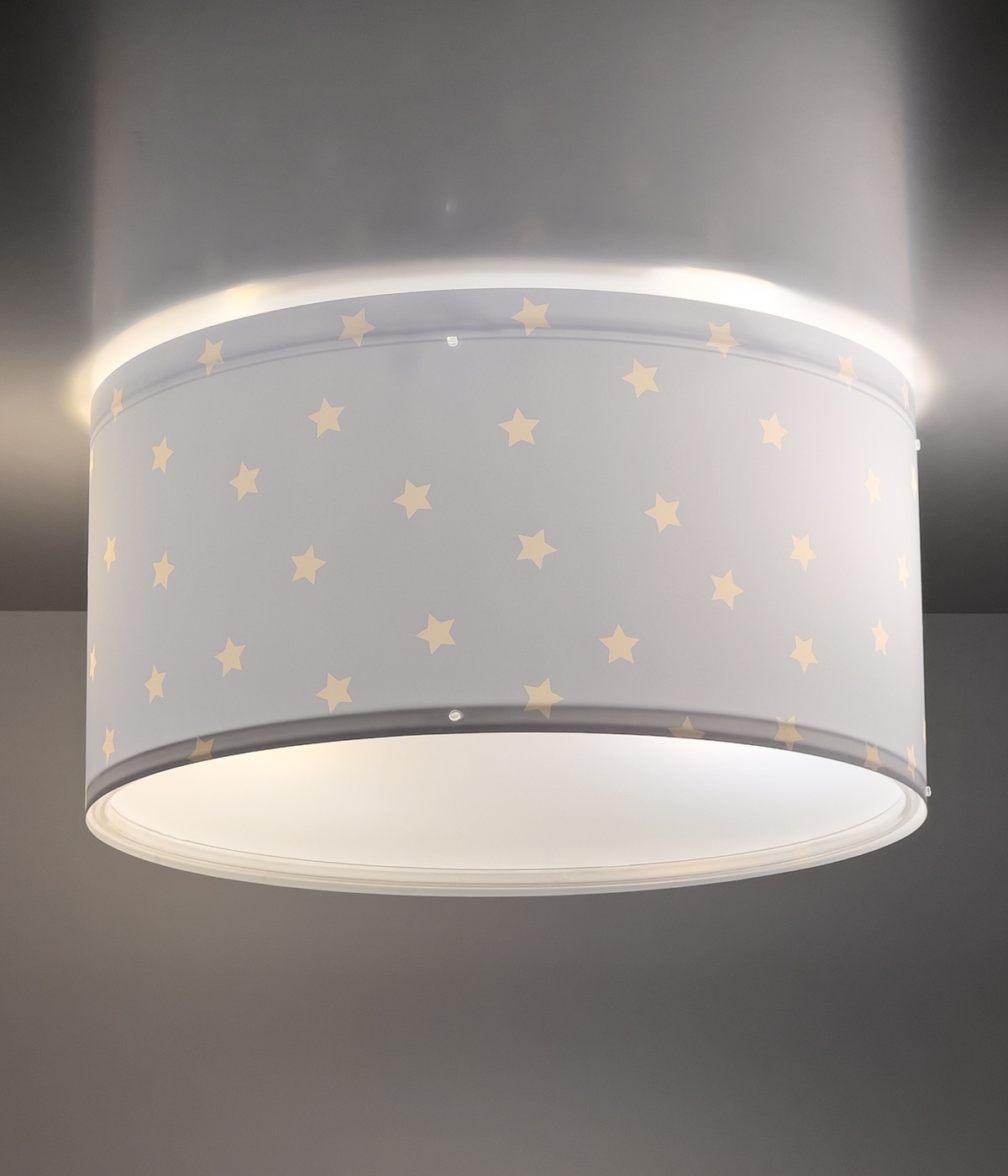 Lampada da soffitto per bambini Star Light con stelle blu che brillano al buio. Contiene inchiostro fluorescente che brilla al buio. Basta lasciarla accesa per 5–10 minuti per caricarla… Poi spegnila e goditi il bagliore magico! Dotata di diffusore antiriflesso per un’illuminazione soffusa e sicura nella cameretta. 100% montata.