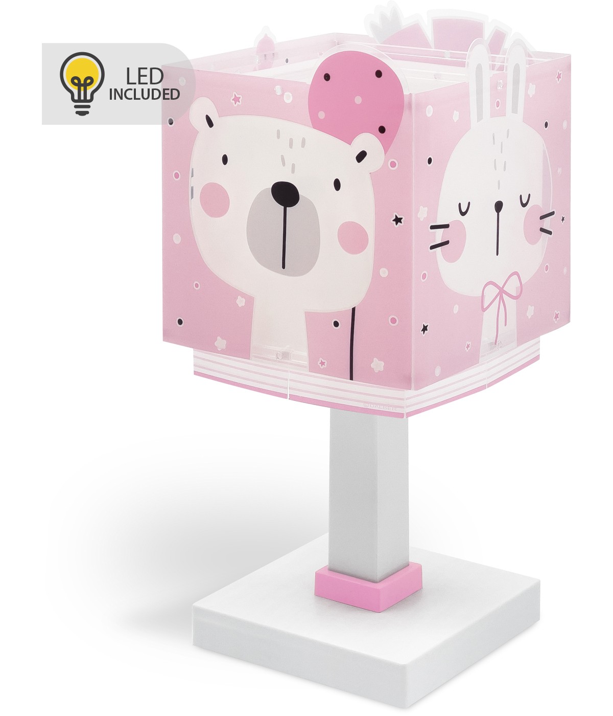 Lampa na stolik nocny dziecięca Baby Jungle to jedna z nowości Dalber. Znajdziesz na niej sympatyczne lwy, tygrysy, misie i króliczki na podwójnej osłonie. To wersja w kolorze różowym, idealna, aby dodać koloru na stoliku nocnym dziewczynek. Lampa dziecięca na stolik Baby Jungle wykonana jest z przezroczystego polipropylenu i ma efekt fluorescencyjny: kontury postaci świecą delikatnie w ciemności przez kilka minut, gdy maluchy wyłączą światło. Maluchy to uwielbiają!