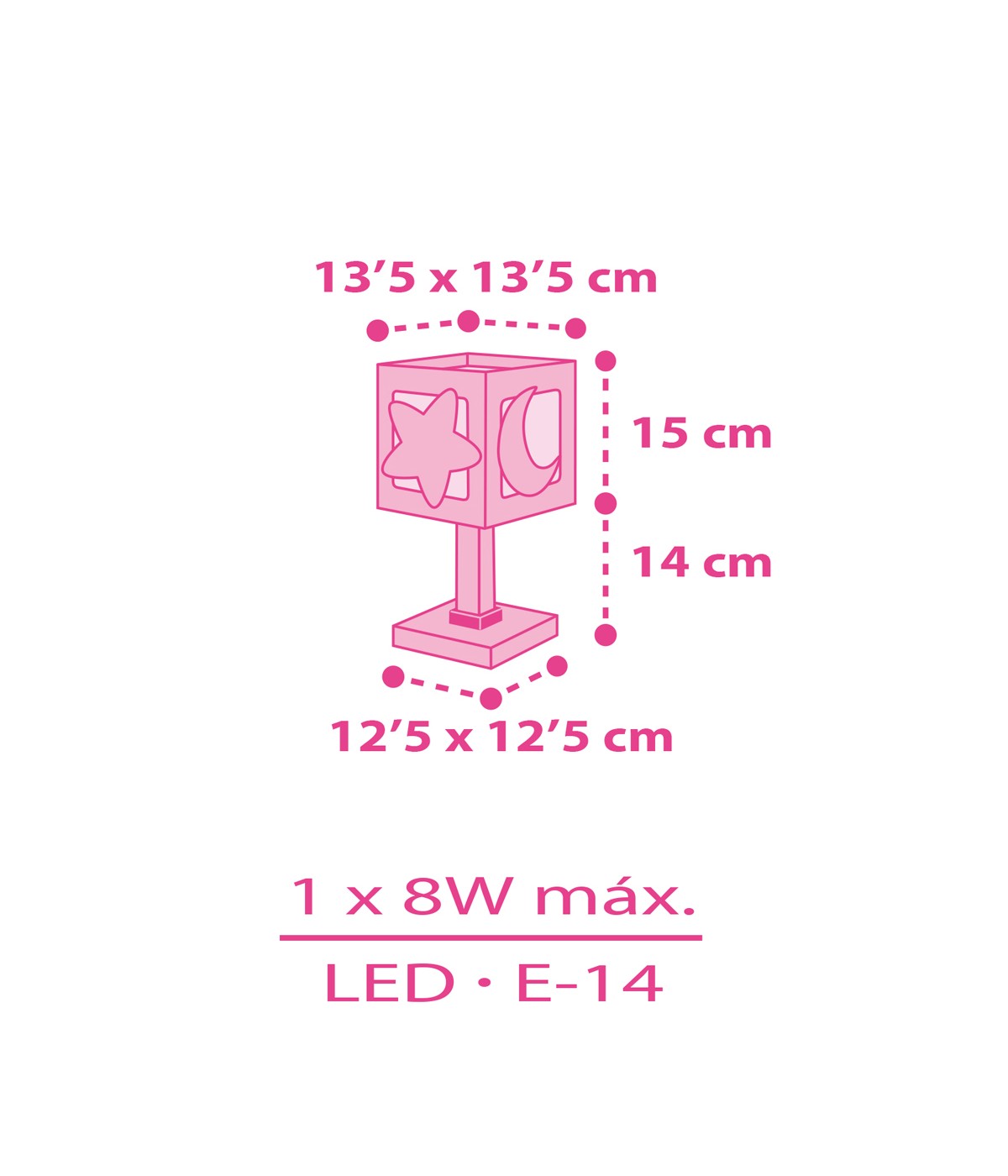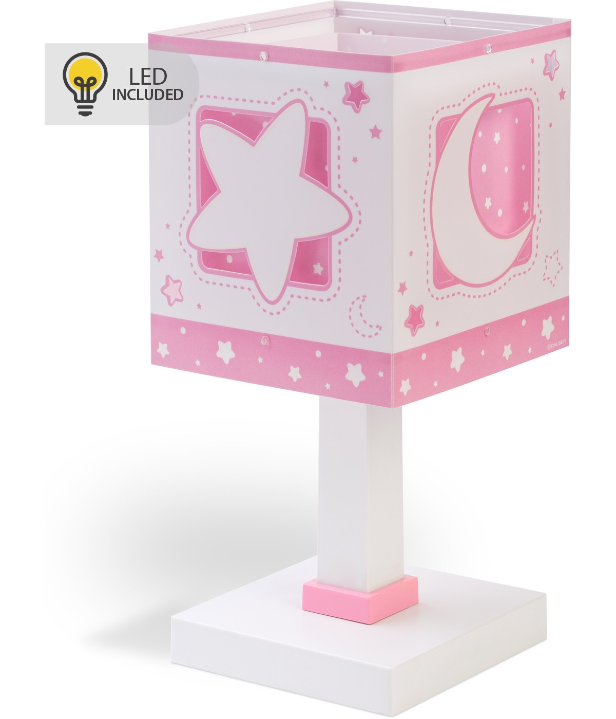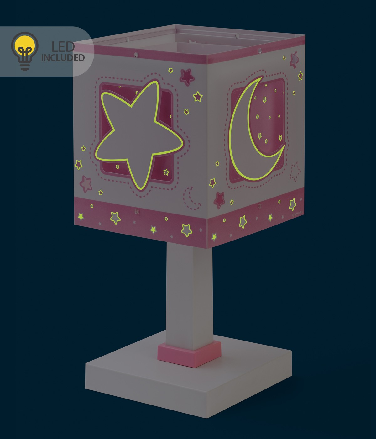 Lampka stołowa Moonlight różowa dla dzieci z księżycem i gwiazdami. Zawiera fluorescencyjny tusz, który świeci w ciemności; wystarczy włączyć na 5–10 minut, aby się naładował… potem wyłącz i ciesz się magicznym blaskiem!