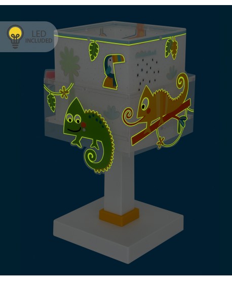 Lampka stołowa Happy Jungle dla dzieci z zabawnymi, kolorowymi kameleonami. Zawiera fluorescencyjny tusz, który świeci w ciemności; wystarczy włączyć na 5–10 minut, aby się naładował… potem wyłącz i ciesz się magicznym blaskiem!