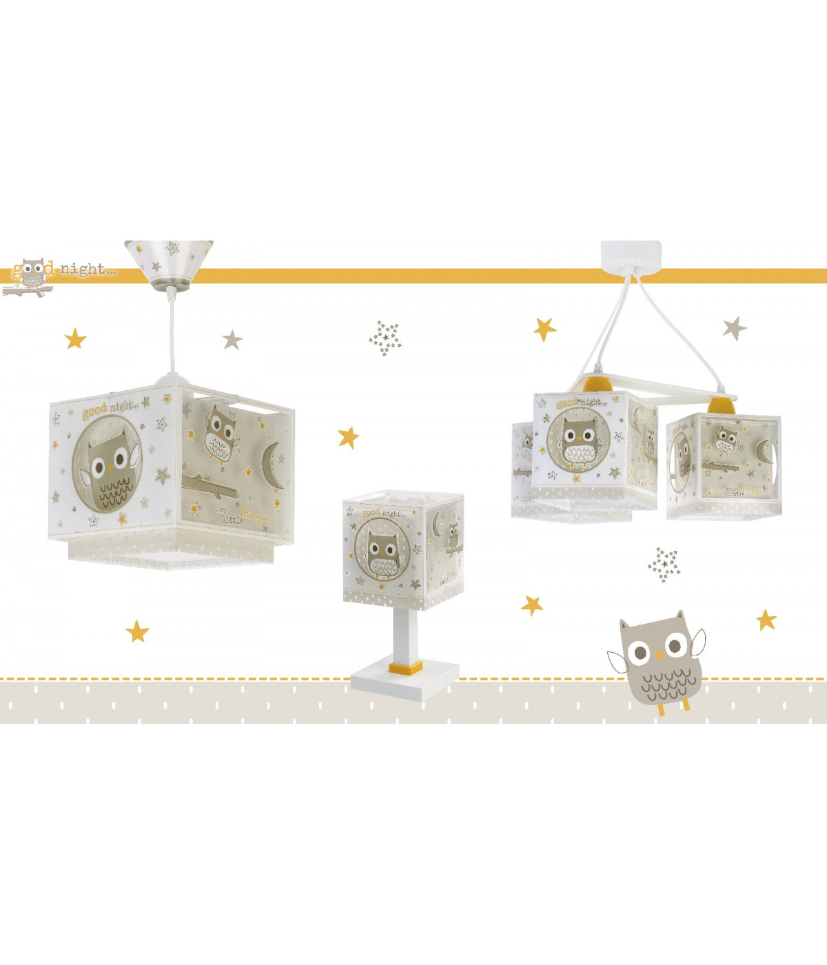 Dziecięca lampka stołowa Good Night jest idealna, jeśli chcesz nadać oryginalny wygląd stolikowi nocnemu maluchów. Dzięki podwójnemu kloszowi z przezroczystego polipropylenu oraz dekoracji z uroczą sową i beżowymi gwiazdkami, które świecą w ciemności, doskonale nadaje się do oświetlania podczas czytania, rysowania lub chwil przed snem.