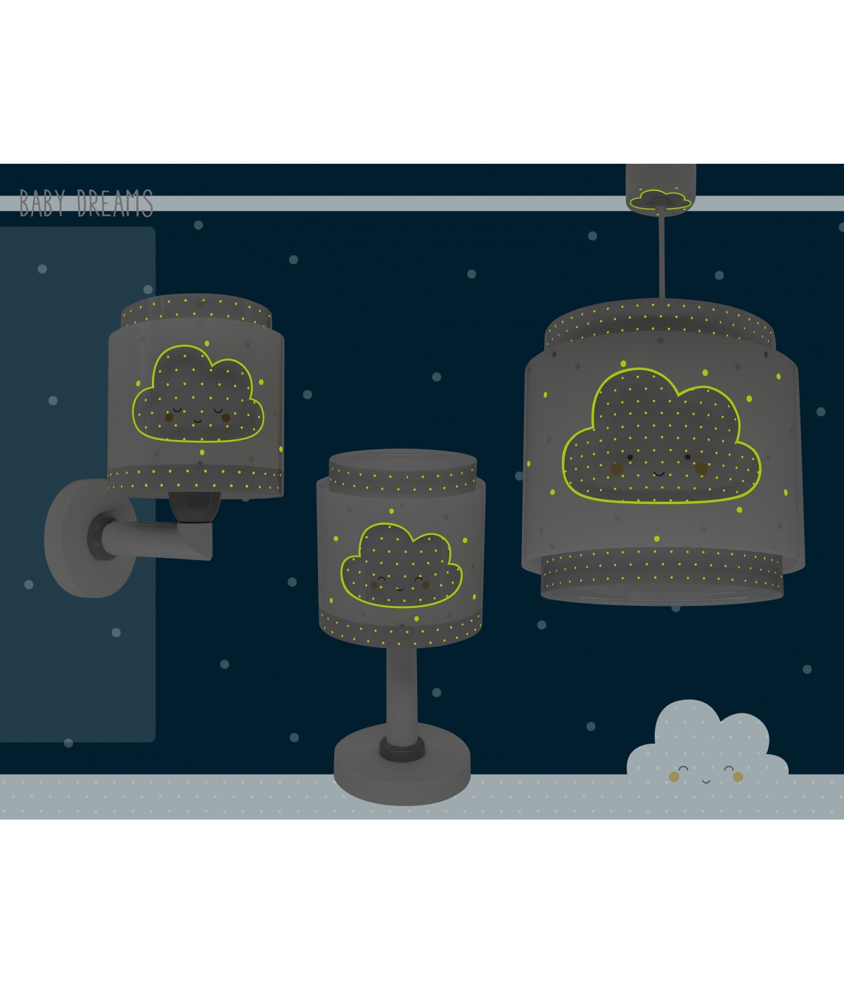 Lampka stołowa Baby Dreams dla dzieci z trzema małymi szarymi chmurkami. Zawiera fluorescencyjny tusz, który świeci w ciemności; wystarczy włączyć na 5–10 minut, aby się naładował… potem wyłącz i ciesz się magicznym blaskiem!