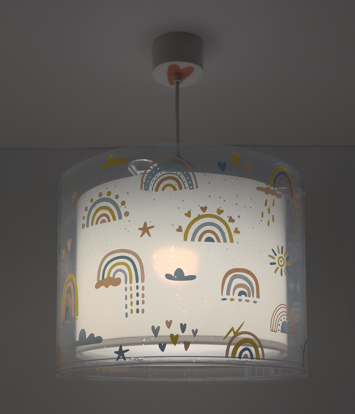 Lampa sufitowa Rainbow dekoruje pokój dziecięcy uroczymi ilustracjami tęczy. Jej delikatne światło tworzy magiczną i przytulną atmosferę, idealną do zabawy, czytania lub odpoczynku. Dekoracyjny element, który wnosi radość i zamienia każdy zakątek w miejsce pełne wyobraźni i zabawy.