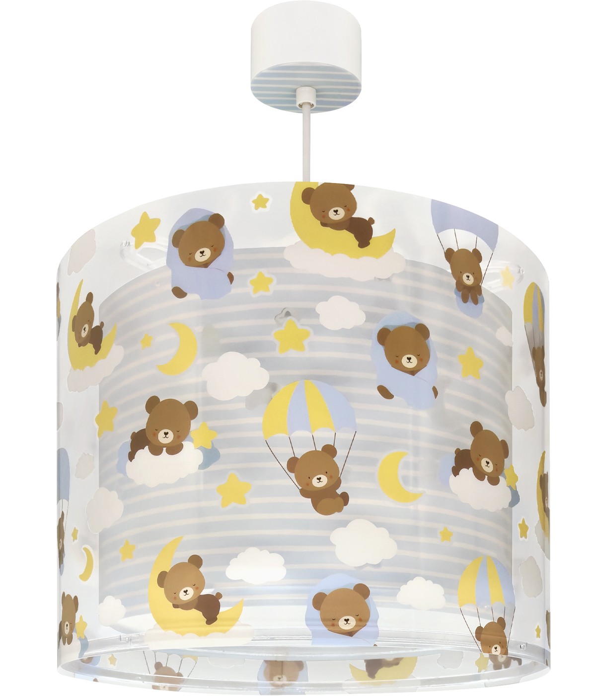 Lampa sufitowa dla dzieci Baby Teddy Niebieski. Zawiera fluorescencyjny tusz, który świeci w ciemności; wystarczy, że będzie włączona przez 5–10 minut, aby się naładowała… Następnie wyłącz ją i ciesz się jej magicznym blaskiem! Posiada również dyfuzor chroniący przed olśnieniem i regulowaną wysokość, idealną do bezpiecznego i komfortowego oświetlenia pokoi i przestrzeni do zabawy. 100% zmontowana.