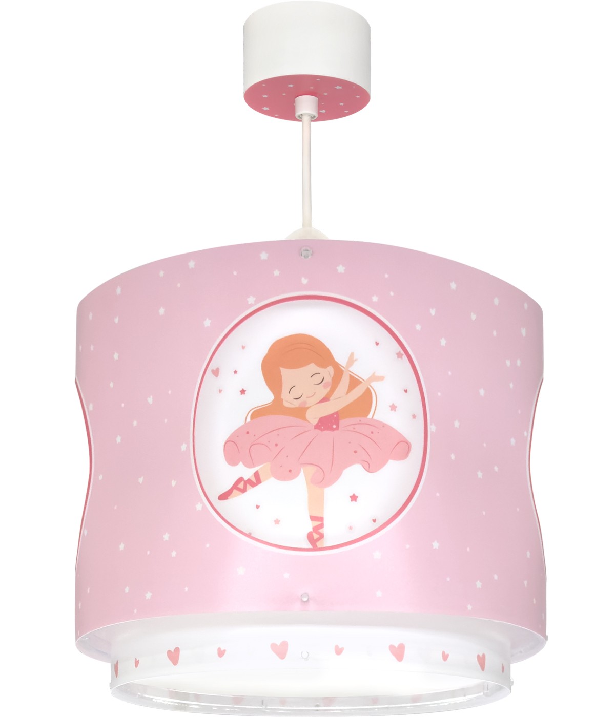 Lampa sufitowa dla dzieci Princess Dance. Zawiera fluorescencyjny tusz, który świeci w ciemności; wystarczy, że będzie włączona przez 5–10 minut, aby się naładowała… Następnie wyłącz ją i ciesz się jej magicznym blaskiem! Posiada również dyfuzor chroniący przed olśnieniem i regulowaną wysokość, idealną do bezpiecznego i komfortowego oświetlenia pokoi i przestrzeni do zabawy. 100% zmontowana.
