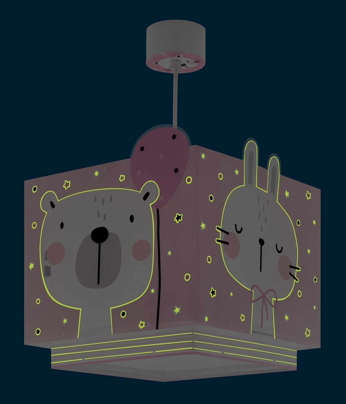 Dziecięca lampa sufitowa Baby Jungle, regulowana na wysokość, z podwójnym przezroczystym abażurem w kolorze różowym. Zawiera fluorescencyjny tusz świecący w ciemności. Wystarczy 5–10 minut ładowania… Następnie wyłącz i ciesz się magicznym blaskiem! Posiada dyfuzor chroniący przed olśnieniem i regulowaną wysokość, idealną do pokoi i przestrzeni zabawy. 100% zmontowana.