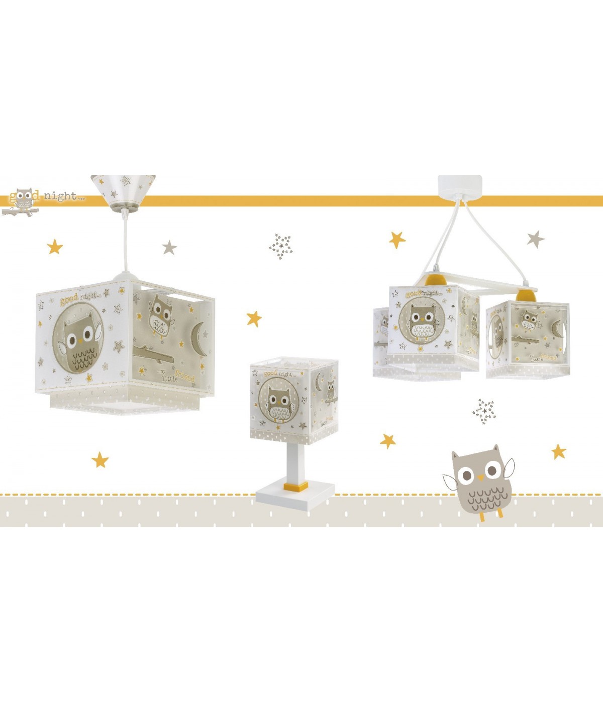 Lampa sufitowa do pokoju dziecięcego Good Night, z uroczą sową i gwiazdkami w kolorze beżowym. Zawiera fluorescencyjny tusz świecący w ciemności. Wystarczy 5–10 minut ładowania… Następnie wyłącz i ciesz się magicznym blaskiem! Posiada dyfuzor chroniący przed olśnieniem i regulowaną wysokość, idealną do pokoi i przestrzeni zabawy. 100% zmontowana.