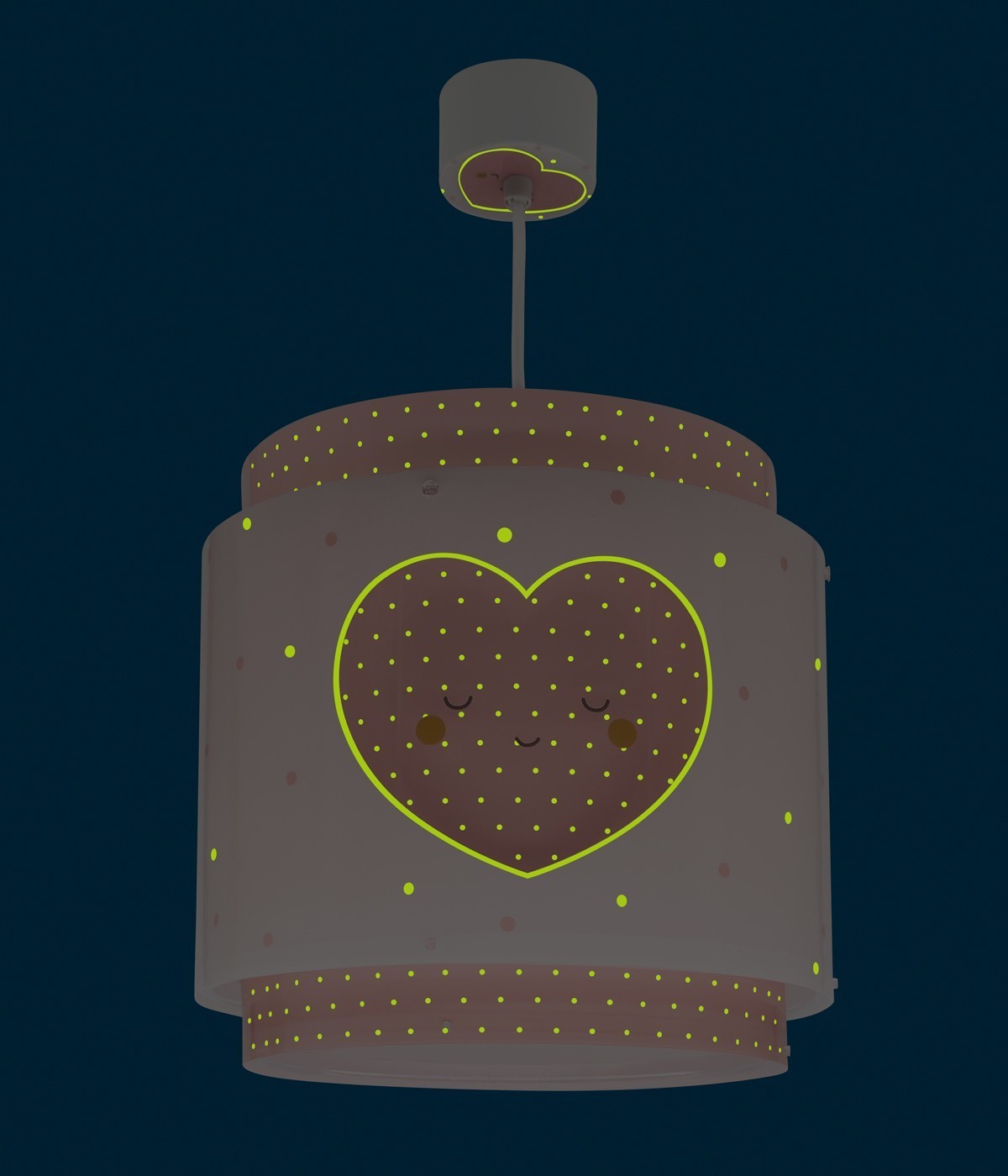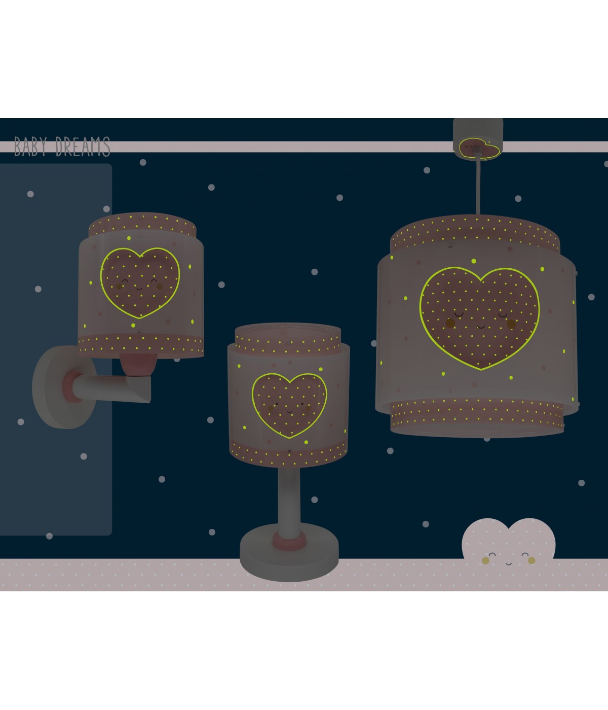 Lampa sufitowa Baby Dreams dla dzieci z trzema małymi różowymi serduszkami. Zawiera fluorescencyjny tusz świecący w ciemności. Wystarczy 5–10 minut ładowania… Następnie wyłącz i ciesz się magicznym blaskiem! Posiada dyfuzor chroniący przed olśnieniem i regulowaną wysokość, idealną do pokoi i przestrzeni zabawy. 100% zmontowana.