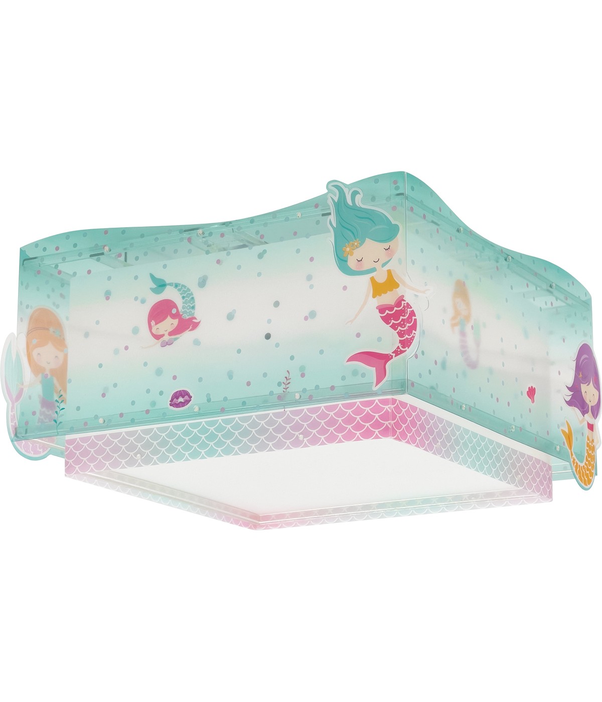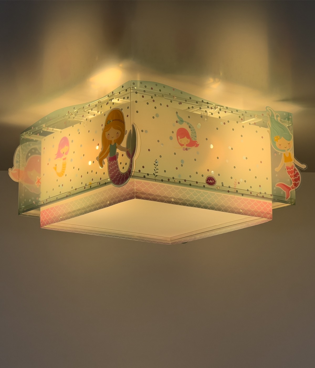 Plafon sufitowy Mermaids dla dzieci z zabawnymi syrenkami. Zawiera fluorescencyjny tusz świecący w ciemności. Wystarczy 5–10 minut ładowania… Następnie wyłącz i ciesz się magicznym blaskiem! Wyposażony w dyfuzor chroniący przed olśnieniem, zapewniając miękkie i bezpieczne oświetlenie pokoju dziecięcego. 100% zmontowana.