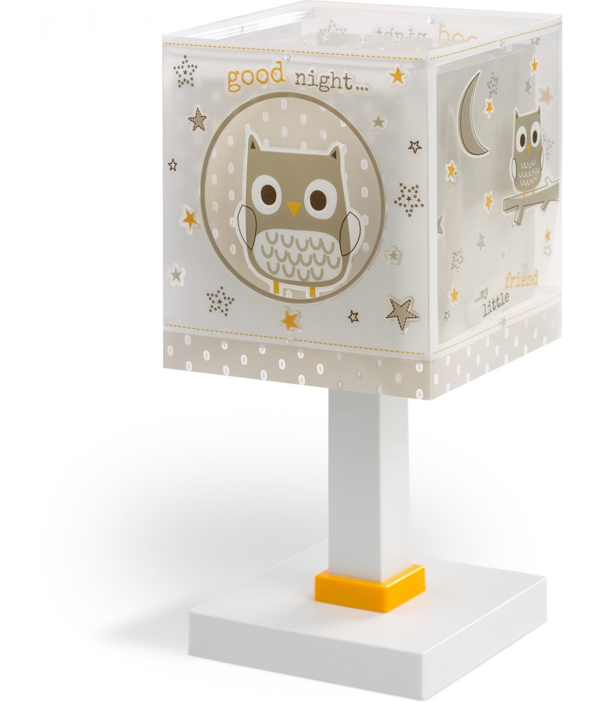 O candeeiro de mesa infantil Good Night é ideal se você deseja dar um ar original à mesinha de cabeceira infantil. Com abajur duplo de polipropileno transparente e decorado com uma linda coruja e estrelas bege que brilham no escuro, é ideal para iluminar enquanto lê, desenha ou nos momentos antes de dormir.