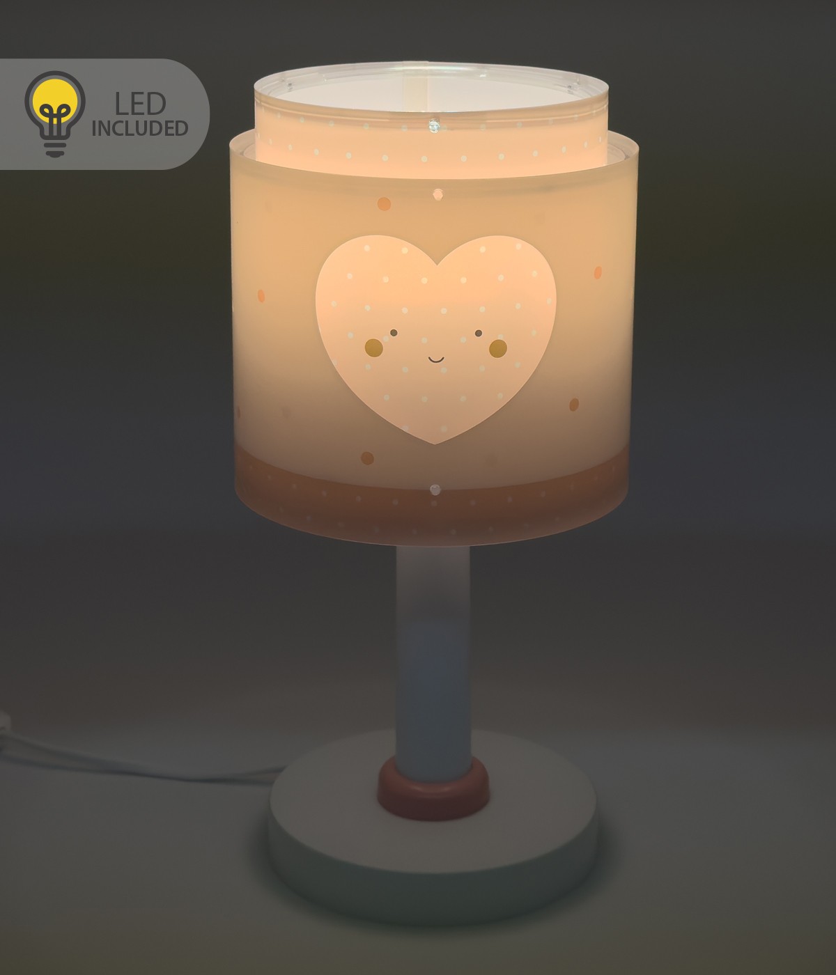 Candeeiro de mesa infantil Baby Dreams com três pequenos corações rosa. Contém tinta fluorescente que brilha no escuro; basta ligá-la por 5–10 minutos para carregar… depois desligue e aproveite seu brilho mágico!