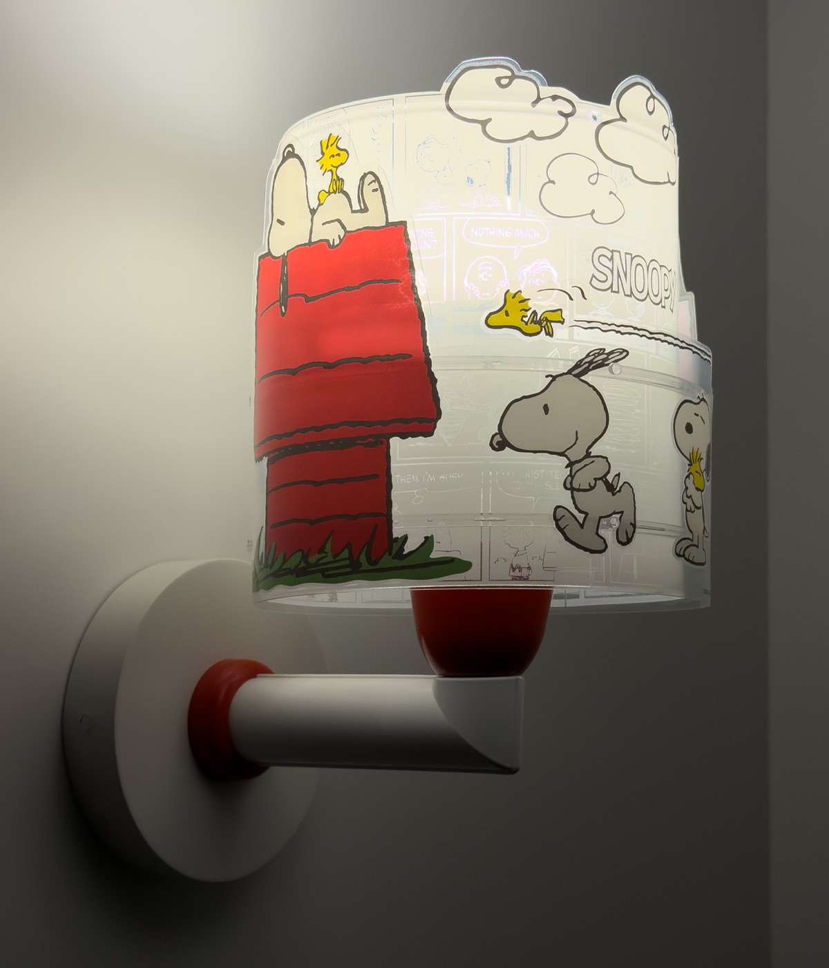 Candeeiro de parede infantil Snoopy. Contém tinta fluorescente que brilha no escuro; basta deixá-lo ligado por 5–10 minutos para carregar… Depois desligue e aproveite o seu brilho mágico! Pode ser instalado diretamente na parede ou através de cabo com interruptor, conforme a necessidade.