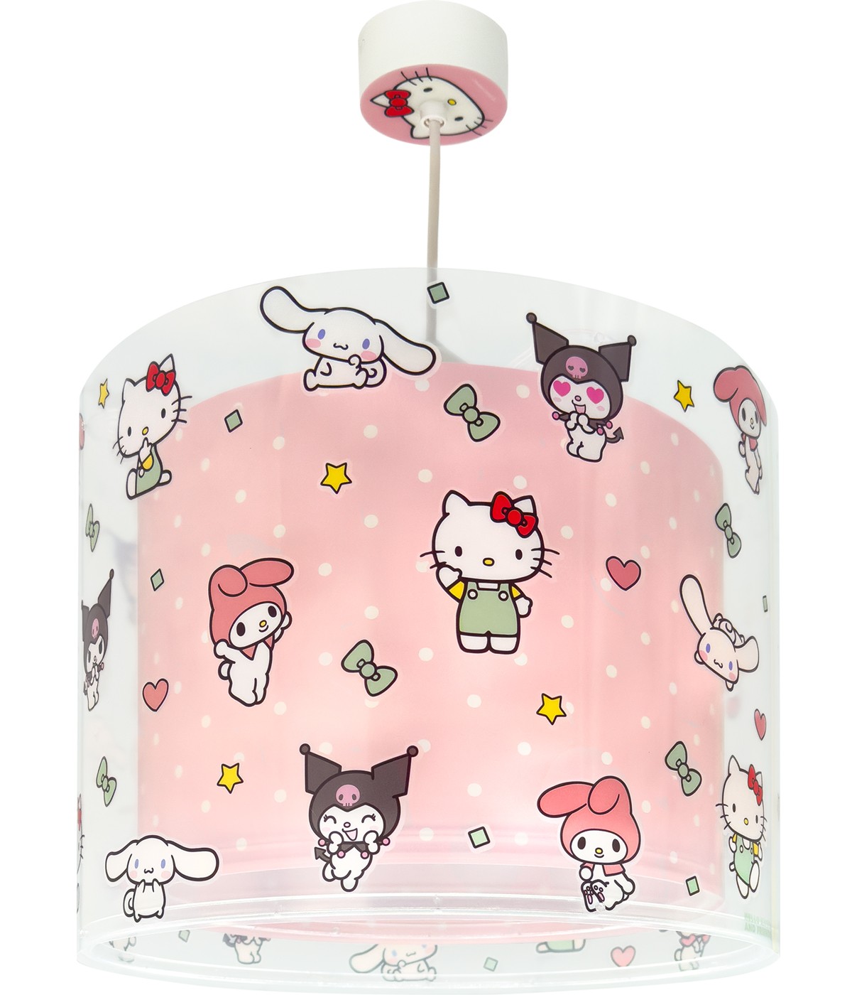 A turma da Hello Kitty & Friends, Kuromi, My Melody e Cinnamoroll está aqui para iluminar e alegrar cada canto do quarto dos mais pequenos! Este adorável candeeiro de teto, com as personagens mais queridas da série, proporciona uma luz suave e acolhedora que torna o espaço ainda mais especial. Ideal para criar um ambiente alegre e cheio de fantasia, o candeeiro é perfeito para acompanhar o descanso ou a brincadeira. Dê um toque único e divertido ao quarto do seu filho ou filha e acompanhe-os com os melhores amigos da Sanrio em todos os momentos!