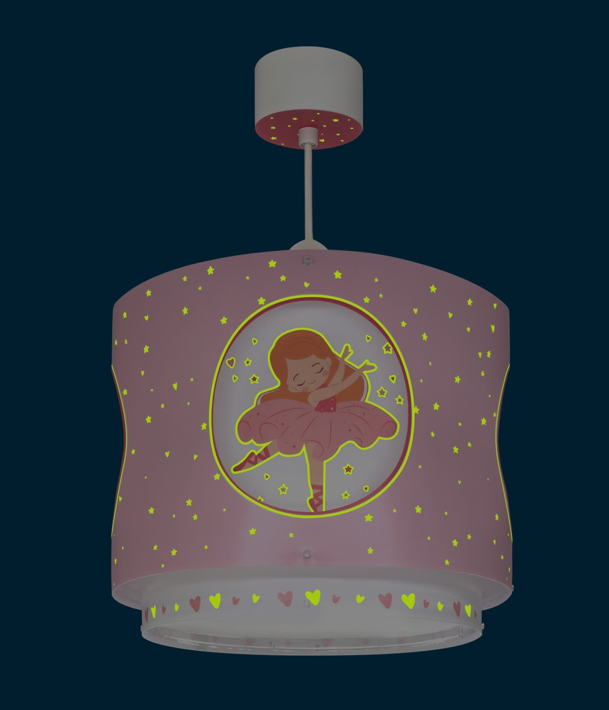 Candeeiro teto infantil Princess Dance. Contém tinta fluorescente que brilha no escuro; basta deixá-lo ligado por 5–10 minutos para carregar… Depois desligue e aproveite o seu brilho mágico! Também dispõe de difusor anti-reflexo e altura regulável, perfeita para iluminar de forma segura e confortável quartos e áreas de brincadeira. 100% montada.