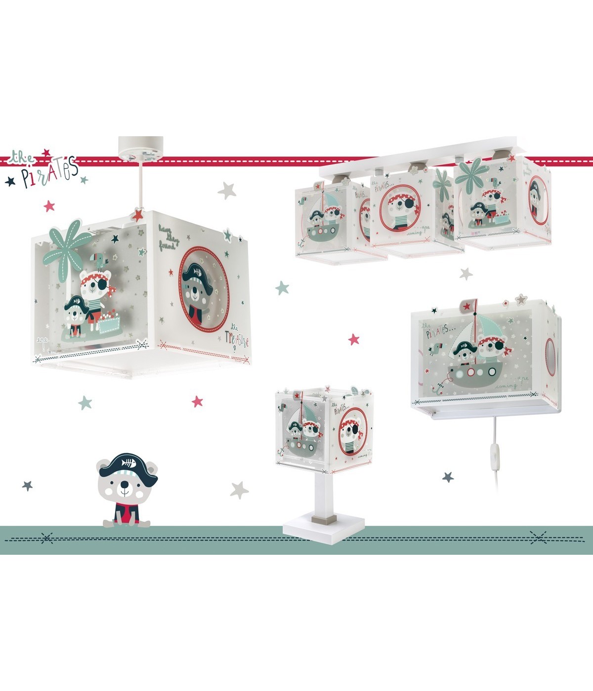 A luminaria do quarto infantil Pirates, com ursos piratas e brilham no escuro. Contém tinta fluorescente que brilha no escuro. Basta 5–10 minutos para carregar… Depois desligue e aproveite o seu brilho mágico! Dispõe de difusor anti-reflexo e altura regulável, perfeito para quartos e áreas de brincadeira. 100% montada.