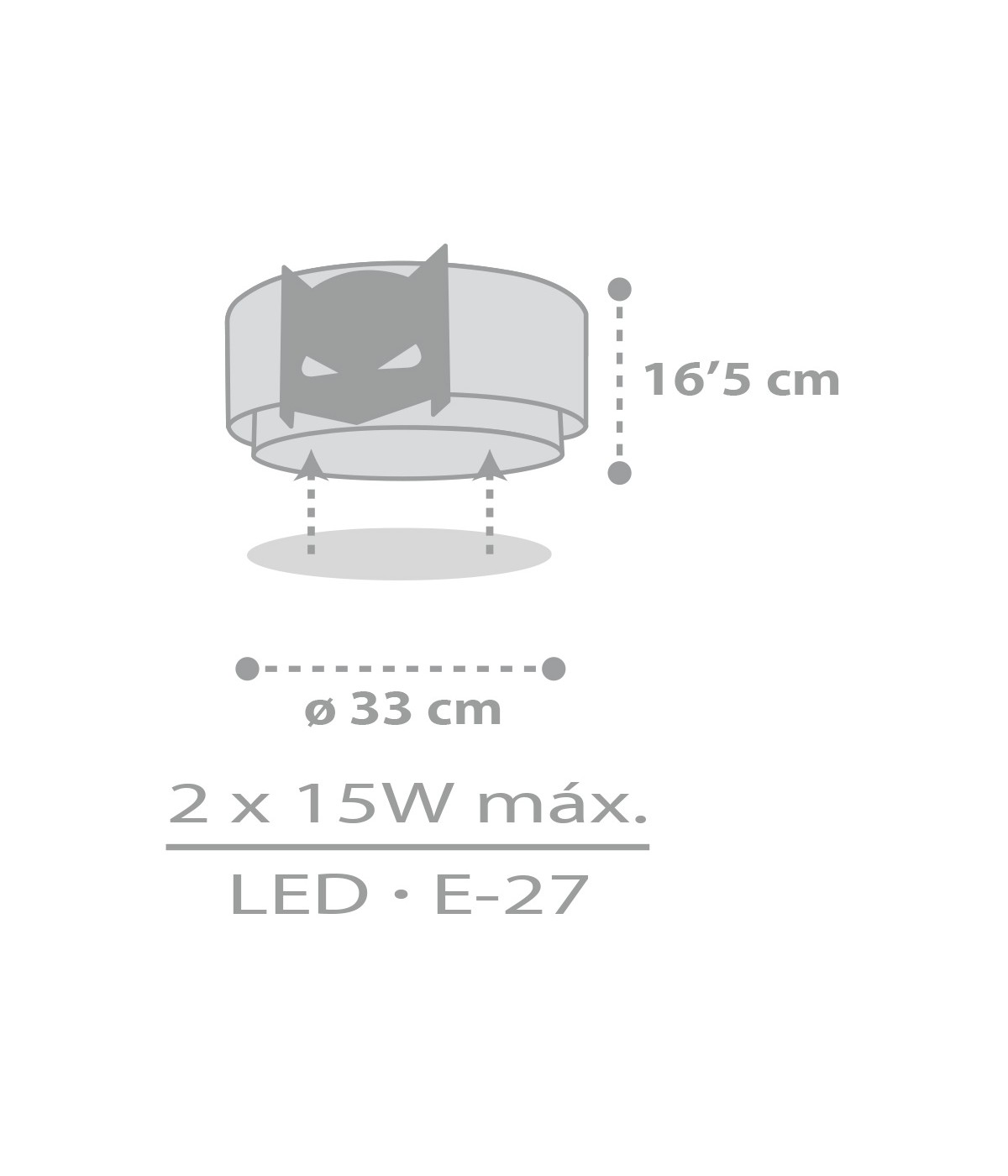 Plafon de tecto infantil de 2 luzes Dark Hero. Ilumine a bravura e a imaginação com este super-herói e transforme cada noite em uma aventura épica. Contém tinta fluorescente que brilha no escuro. Basta 5–10 minutos para carregar… Depois desligue e aproveite o seu brilho mágico! Inclui difusor anti-reflexo para uma iluminação suave e segura no quarto das crianças. 100% montada.