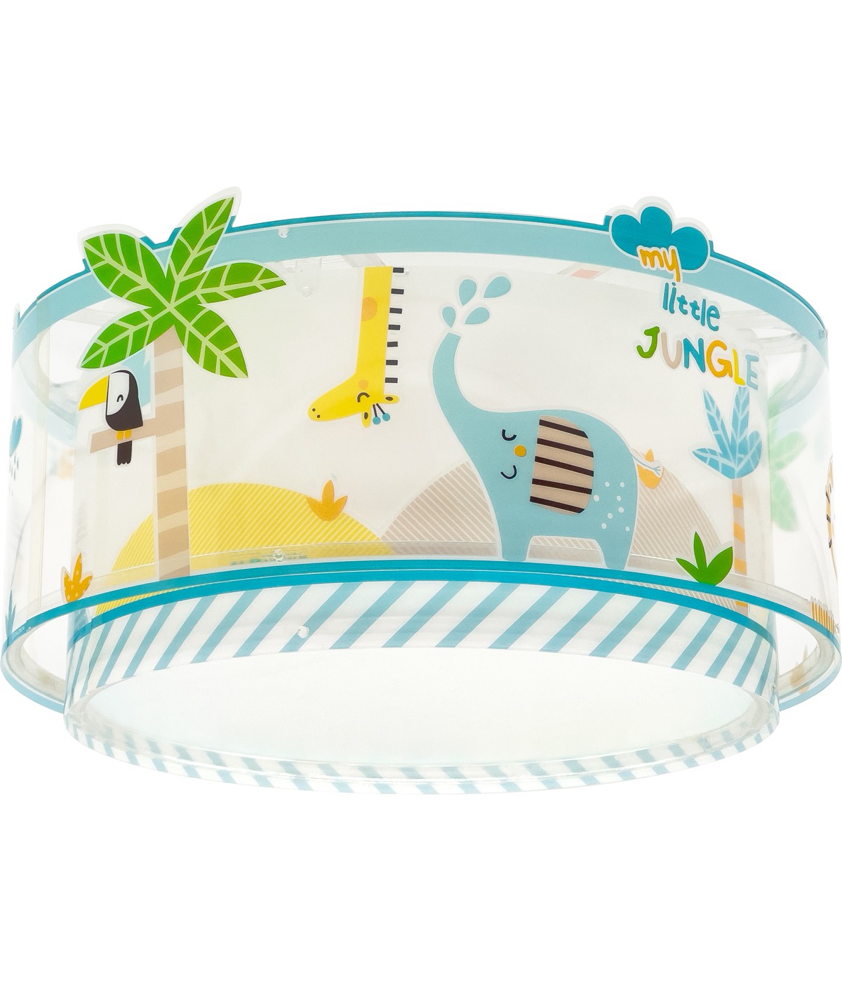 Plafon de teto de 2 luzes com animais da selva, fabricado com um abajur duplo transparente, pode agora decorar e iluminar com estes simpáticos amigos da selva.